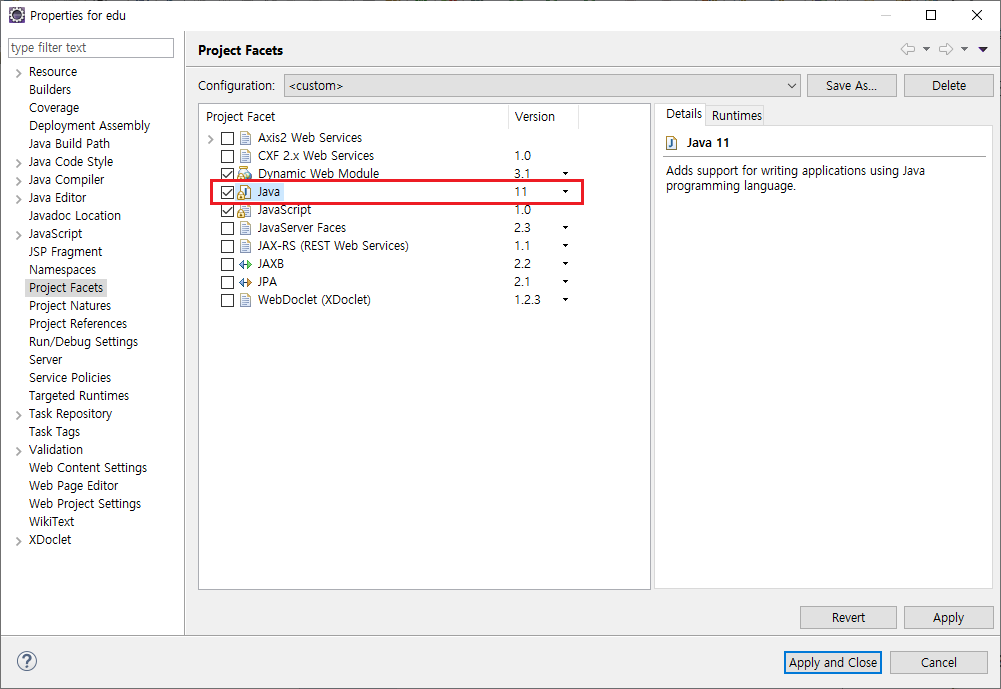 -> 새로 생성한 프로젝트 우측클릭 - properties - Project Facets 의 Java 부분을 위에서 확인한 버전으로 맞춰준다.